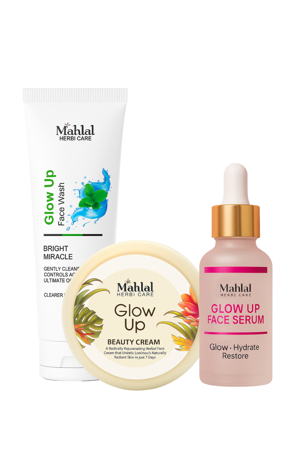 A complete 3-step glow routine for clear, bright, and hydrated skin. Includes the Glow Up Face Wash, Glow Up Serum, and Mahlal Beauty Cream — your all-in-one solution for daily radiance and healthy, youthful skin.